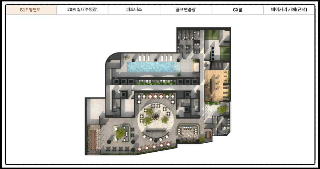 - 실내 수영장: 20m 길이의 고급 수영장과 피트니스 센터, 골프 연습장이 입주민 전용으로 운영됩니다.