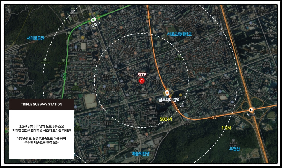 - 자연환경: 우면산과 서리풀공원이 있어 도심 속에서도 자연과 함께하는 생활을 누릴 수 있습니다.