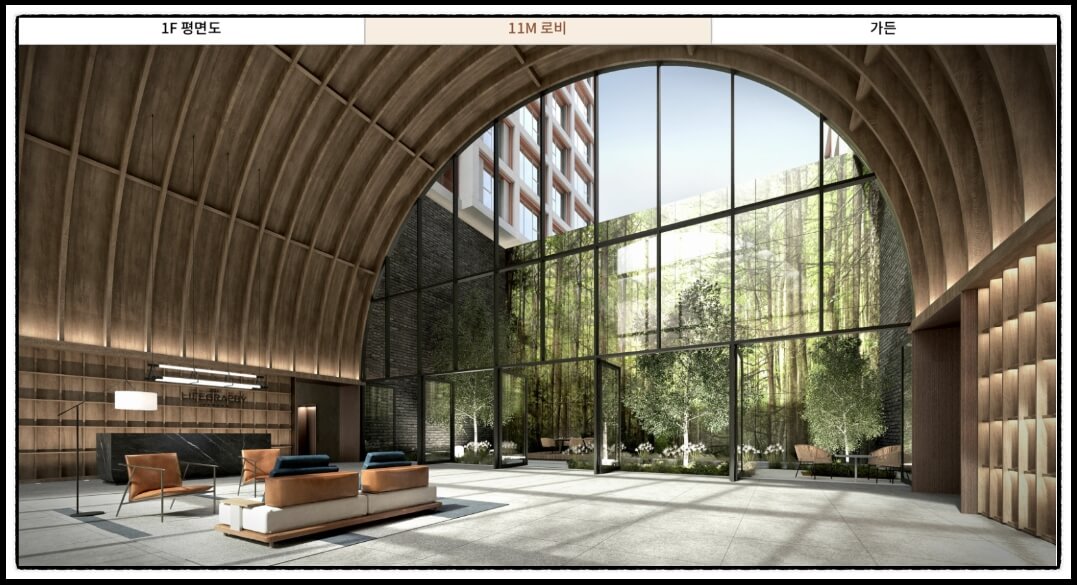 필로티 구조: 1층은 8m 높이의 아치형 설계를 통해 자연 채광과 쾌적한 환경을 제공합니다.