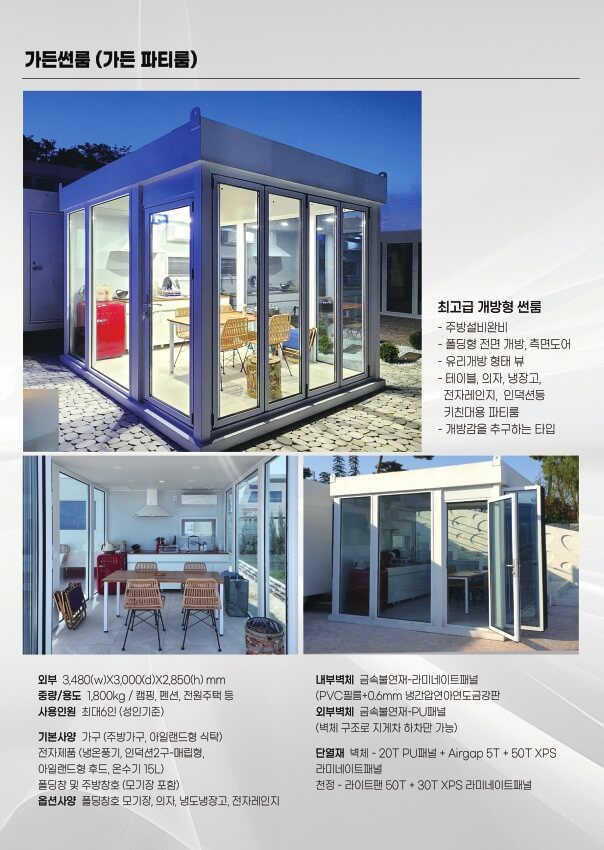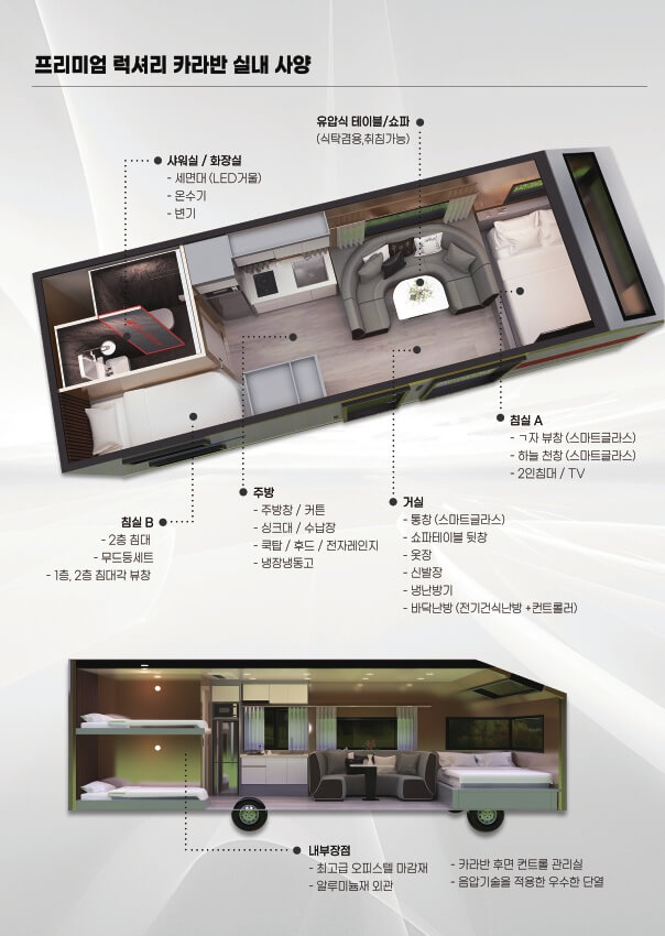 카라핑하우스는 대형 카라반과 썬룸이 포함된 주거 시설로 구성되어 있으며, 주방과 같은 생활에 필수적인 시설이 완비되어 있습니다. 약 8m 크기의 대형 카라반은 5~6인 가족이 생활할 수 있는 넉넉한 공간을 제공합니다. 또한 별도의 글램핑 텐트와 캠핑 시설이 설치되어 있어 주거와 레저를 동시에 즐길 수 있습니다.