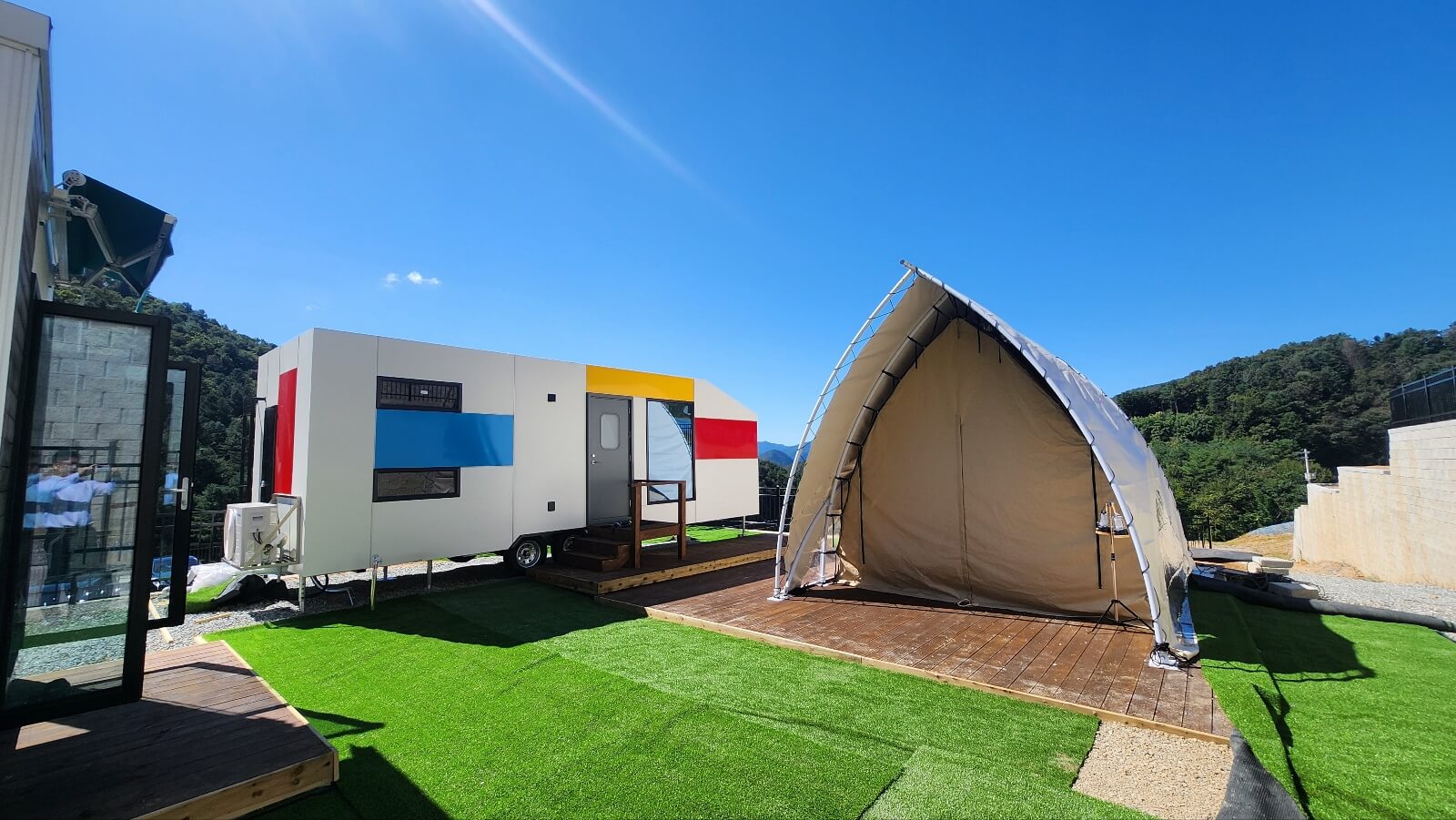 카라핑하우스는 대형 카라반과 썬룸이 포함된 주거 시설로 구성되어 있으며, 주방과 같은 생활에 필수적인 시설이 완비되어 있습니다. 약 8m 크기의 대형 카라반은 5~6인 가족이 생활할 수 있는 넉넉한 공간을 제공합니다. 또한 별도의 글램핑 텐트와 캠핑 시설이 설치되어 있어 주거와 레저를 동시에 즐길 수 있습니다.