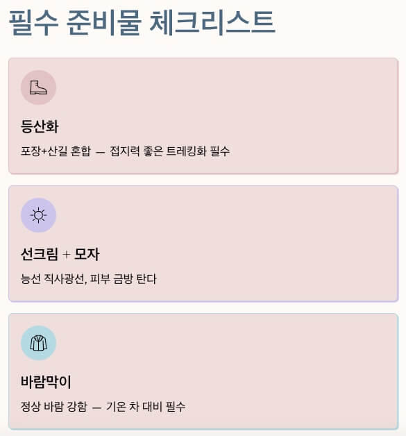 - ✅ 얇은 겉옷: 산 정상은 바람이 세서 기온 차가 큽니다. 바람막이 하나는 꼭 챙기세요.