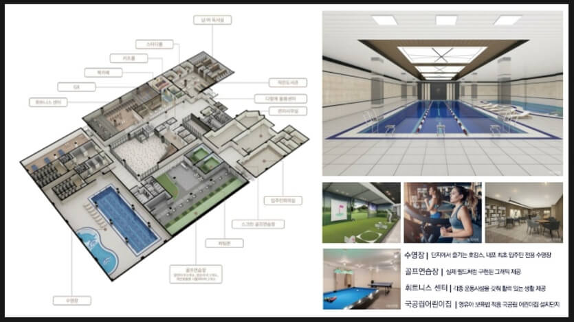 그 외에도 피트니스 센터, 스크린 골프 연습장, 어린이집, 북카페, 게스트하우스 등 다양한 커뮤니티 시설이 마련되어 있어 입주민의 라이프스타일을 완벽히 지원합니다.
