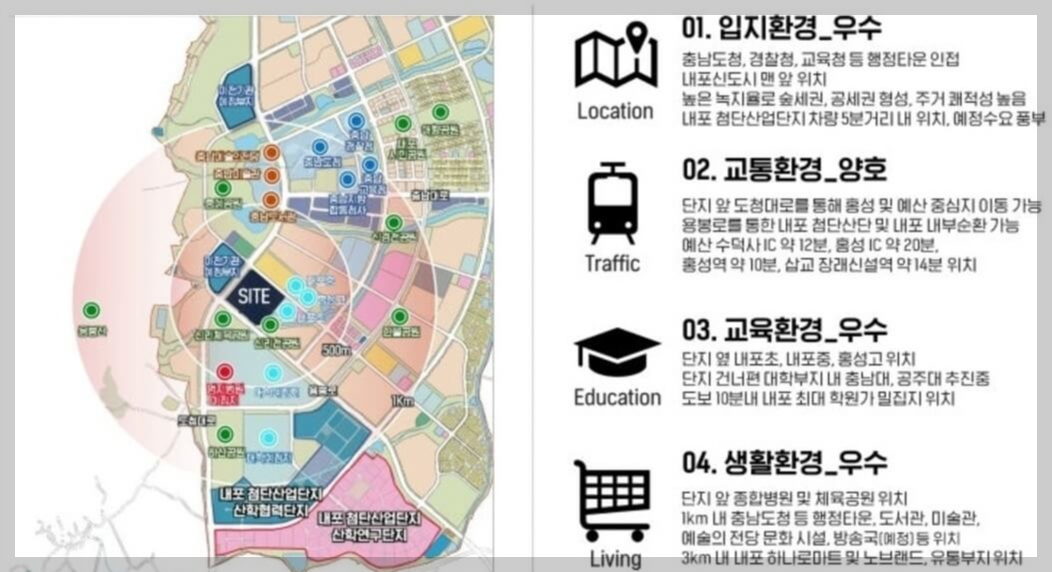 단지 도보 5분 거리에는 내포초, 내포 중, 홍성고가 위치해 있으며, 인근에 충남대학교와 공주대학교 캠퍼스 설립이 추진 중입니다. 내포 최대 학원가가 도보 10분 거리에 있어 학부모들에게 매력적인 입지입니다.