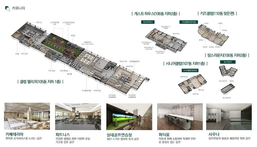 • 기타 시설: 실내 골프연습장, 사우나, 공유 오피스 등 입주민의 다양한 필요를 충족시킬 수 있는 공간을 마련했습니다.