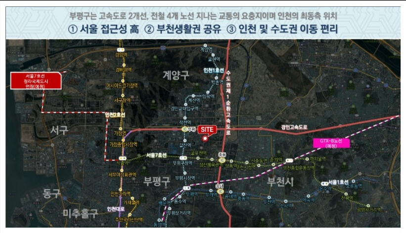 - 차량 이용: 경인고속도로 부평 IC, 수도권 제1순환고속도로 중동 IC, 국도 6호선 등을 통해 서울 및 경기 주요 도시로의 이동이 수월합니다.
