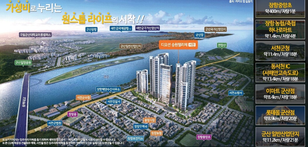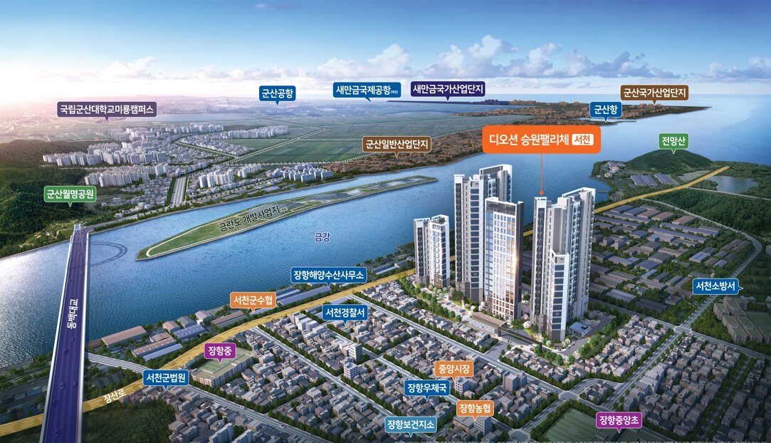 디오션 승원팰리체 서천은 장항항 뒷편에 위치하며, 군산과의 접근성이 뛰어납니다.