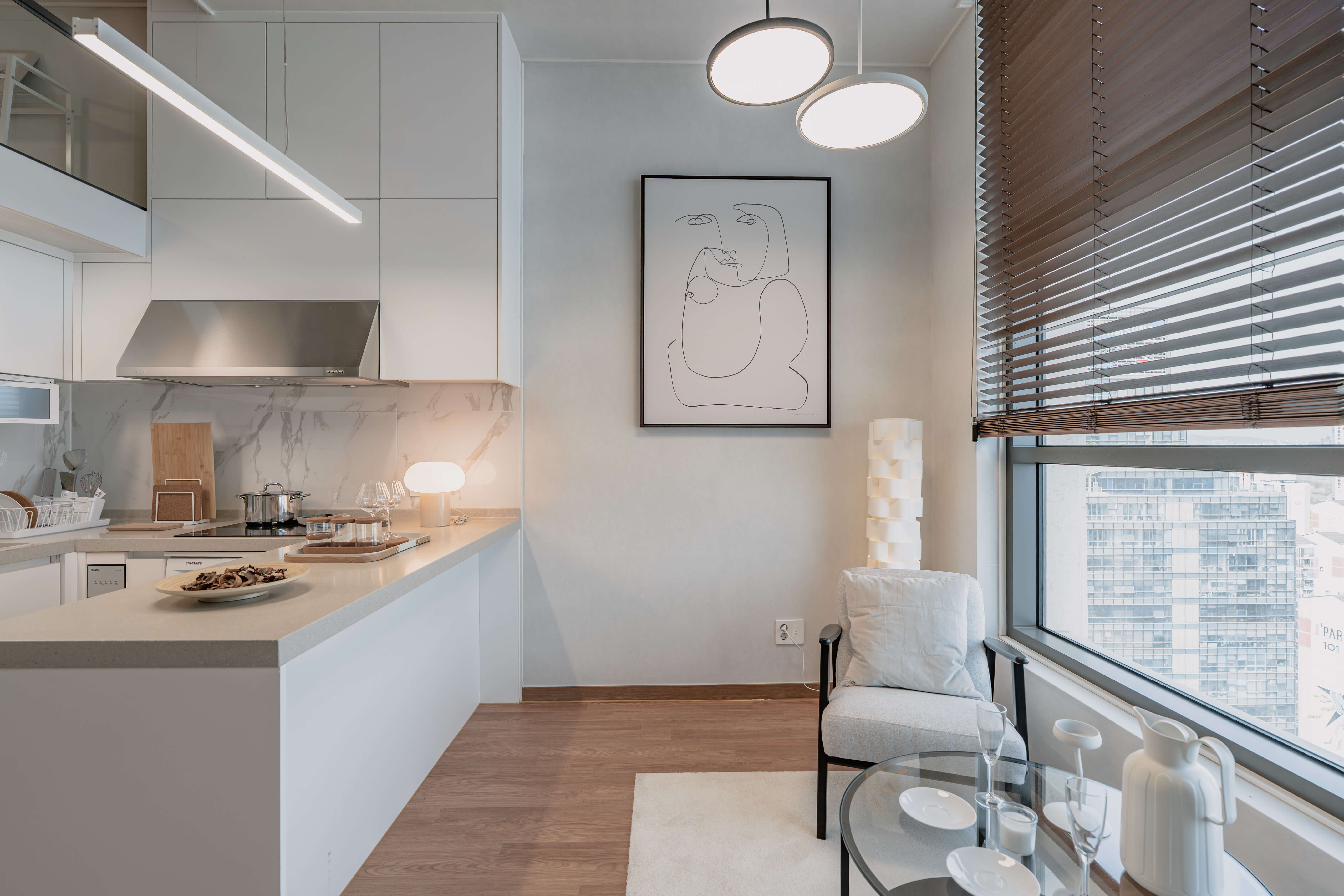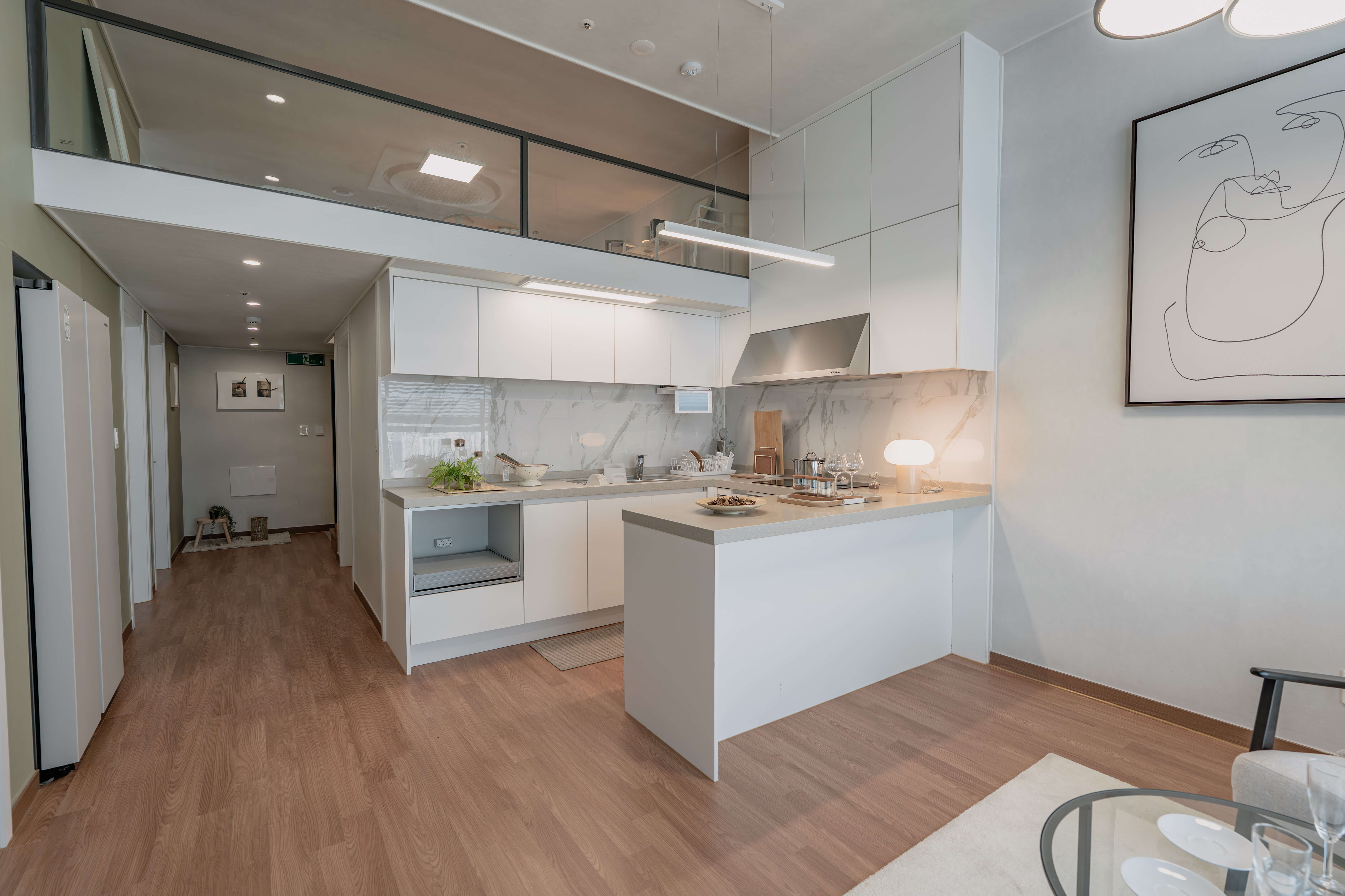 거실은 층고 3.17m로 개방감이 뛰어나며, 통창 구조로 채광과 조망권을 극대화했습니다. 또한 LDK 구조(거실+주방+식당 일체형)로 설계되어 공간 효율성이 높고, 실제 거주 시 생활 동선이 매우 자연스럽습니다. 이러한 구조는 최근 주거 트렌드인 ‘개방형 라이프스타일’을 반영한 결과라고 생각됩니다.