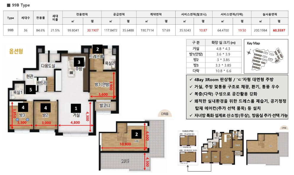 단지는 전 세대 남향으로 배치되어 제주 하늘의 햇살과 바람을 자연스럽게 즐길 수 있습니다. 펜트하우스, 메조넷(복층), 애틱(다락), 오픈발코니 등 다양한 하이엔드 설계가 적용되어 입주민에게 품격 있는 주거 공간을 제공합니다. 서비스 면적은 최소 11평에서 최대 83평까지 제공되며, 다락 공간을 활용해 실사용 면적을 극대화했습니다.