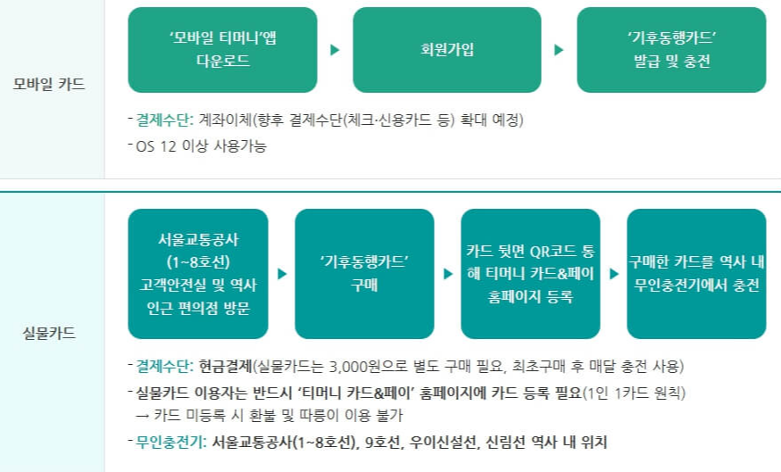 모바일카드는 안드로이드폰 이용자만 구매 가능하며, '모바일 티머니' 앱을 통해 기후동행카드를 선택하고 계좌 등록 후 계좌이체 방식으로 충전할 수 있습니다.