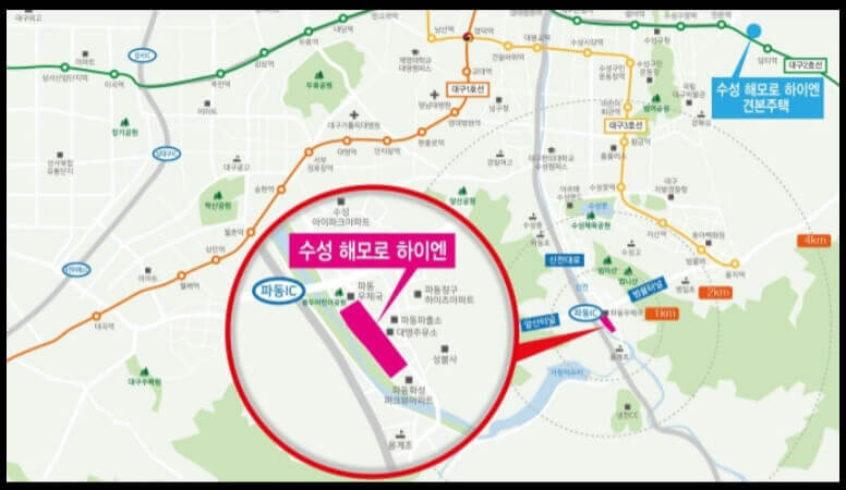 해모로 하이엔은 파동 IC가 바로 옆에 위치하여 교통 편의성을 제공합니다. 인접한 학군은 수성초, 용계초, 덕화중, 지산중, 수성중. 고, 능인중. 고, 남산고, 경북고 등을 대구 최고의 학군을 자랑합니다.