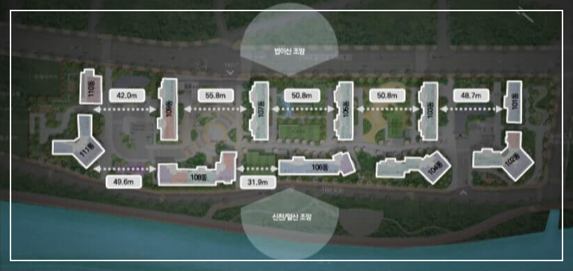 해모로 하이엔은 넓은 인동거리를 확보하여 신천과 법이산을 감상할 수 있는 조망을 제공합니다. 이를 통해 주민들은 자연환경과 도시 경치를 동시에 즐길 수 있습니다. 55.8m에 이른는 넓은 인동거리 확보