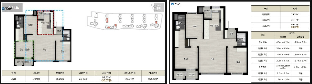 75형 - 공급면적 99.43㎡(30.09평) 59형(51.53%)/75형(11.85%)/84형(16.51%)/84Agud(13.21%)/84Bgud(6.13%)