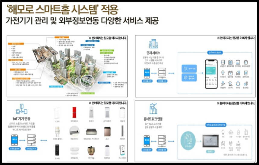 해모로 하이엔은 다양하고 품격 높은 커뮤니티 시설을 갖추고 있습니다. 휘트니스센터, GX룸, 실내골프연습장, 열린도서관 등이 제공되며, 내장재로는 고품격 스톤 내장재와 프리미엄급 시공된 주방, 아트월, 욕실 등을 갖추고 있어 상품성을 높입니다. 해모로 하이엔은 스마트홈 시스템을 적용하여 가전기기 관리 및 외부 정보 연동을 제공합니다. 스마트 시스템 탑제된 가전기기로 생활 편의성을 높이며, 환풍기, 음식물 처리기 등 다양한 품목을 무상으로 제공하여 주민들의 편안한 생활을 지원합니다.