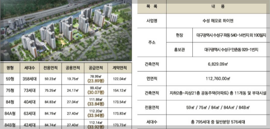 해모로 하이엔은 대구 수성구 파동 지역에서 약 4,000여 세대의 재개발 및 재건축 사업에 포함되어 있으며, 대규모 주거단지로 형성 중으로 30~40평형대의 아파트 공급이 많으며 20평대는 부족한해 더욱 해모로 하이엔에 관심이 모아지고 있습니다.