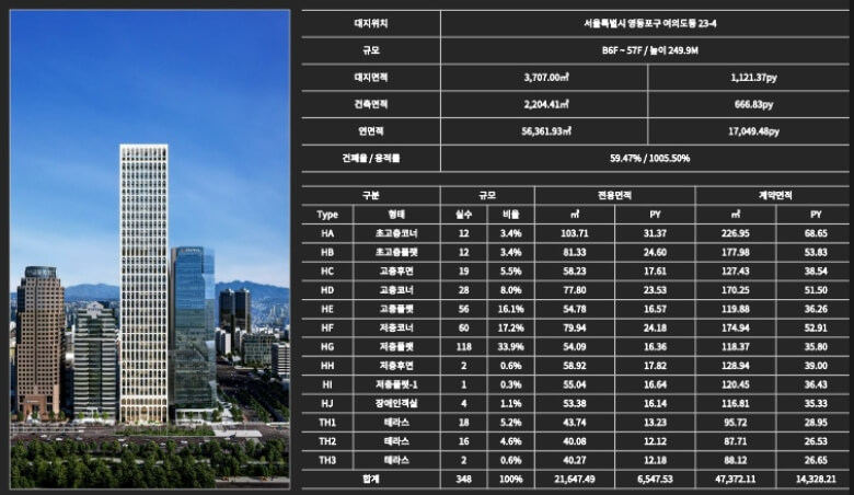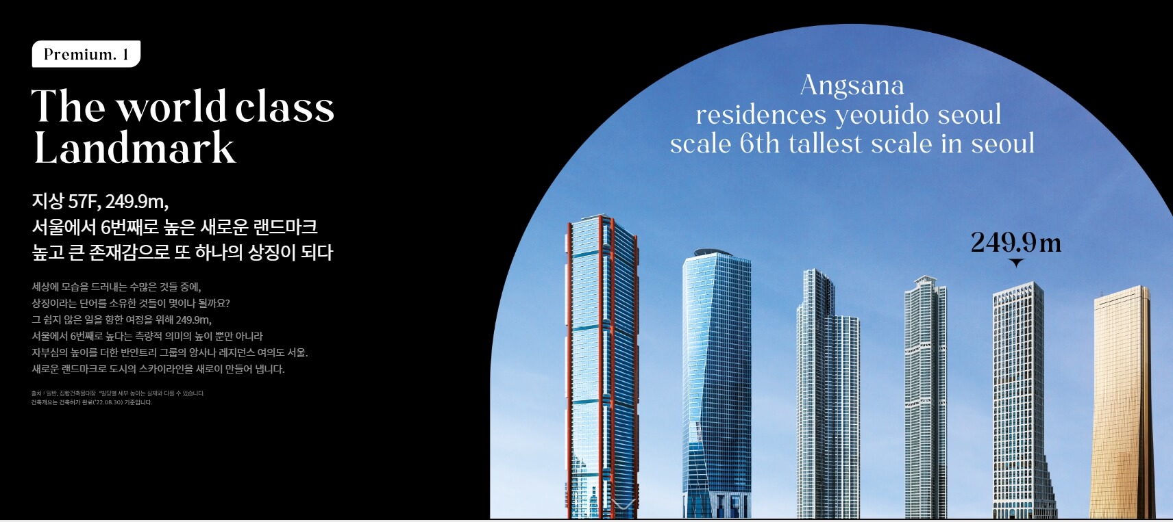 현대엔지니어링이 서울 여의도에 초고층 레지던스 단지를 선보입니다. '앙사나 레지던스 여의도 서울'은 지하 6층에서 지상 57층까지 올라가는 고층 건물로, 서울시 영등포구 여의도동에 위치하며, 총 348실의 레지던스, 업무 및 근린생활시설을 갖추고 있습니다. 건물 높이는 249.9m로 서울에서 여섯 번째로 높은 건축물이 될 예정이며, 오는 2026년 준공을 목표로 하고 있습니다.