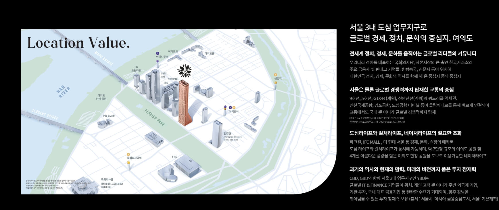 앙사나 레지던스 여의도 서울은 IFC Mall, 현대백화점 더현대 서울, 여의도공원, 샛강생태공원, 한강시민공원 등 풍부한 주변 인프라와 가까워 생활 편의성이 뛰어납니다. 여의도 내 다양한 개발 호재도 더해져 미래 가치가 더욱 높아지고 있습니다.