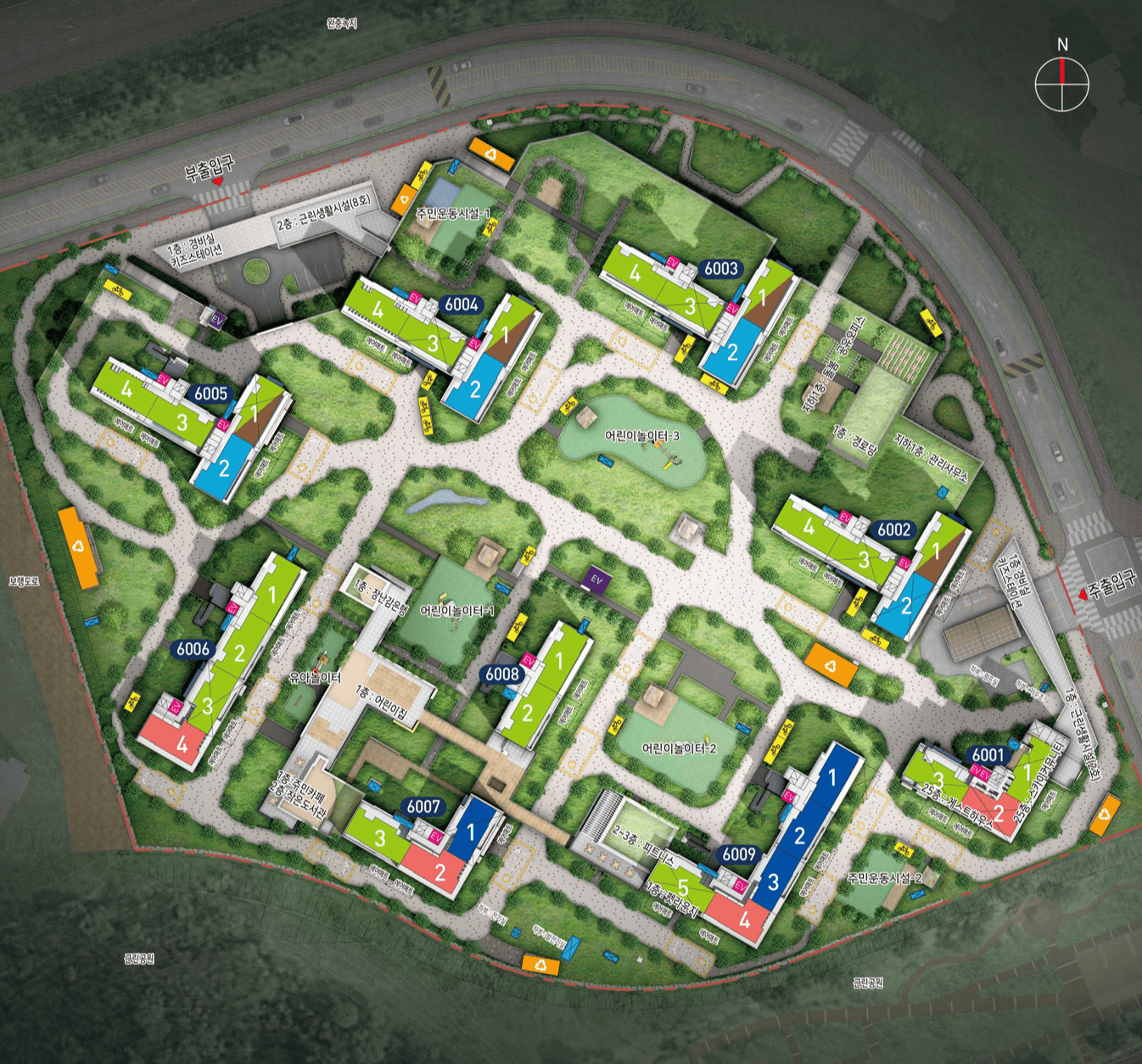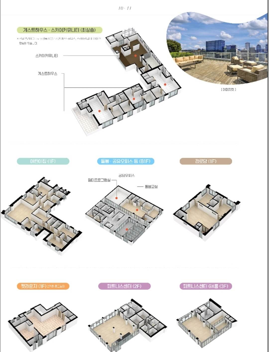 단지 내에는 주민들의 생활 편의를 위한 다양한 시설이 들어설 예정입니다. 작은 도서관, 피트니스 센터, 어린이집, 게스트하우스, 키즈짐 등 가족 구성원 모두가 만족할 수 있는 편의시설이 마련되어 있으며, 게스트하우스와 스카이커뮤니티 등 다양한 커뮤니티 공간을 통해 이웃과의 소통과 여가 활동도 즐길 수 있습니다.