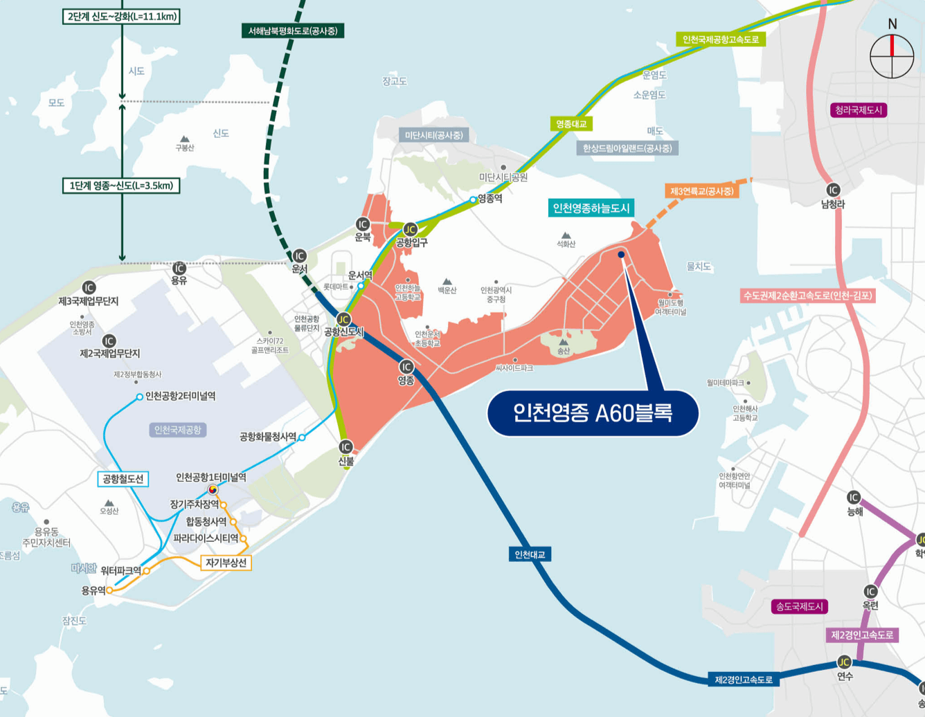 서울과 수도권 접근성을 높이는 영종국제도시의 교통망은 매우 뛰어납니다. 공항철도, 인천국제공항고속도로, 제2경인고속도로를 통해 서울과 수도권으로의 접근이 수월하며, 영종을 지나가는 GTX-D 노선과 E 노선이 국가 철도망계획에 포함되어 현재 정부 임기 내 예타 통과를 목표로 하고 있습니다. 특히 내년 개통 예정인 제3연륙교는 청라국제도시와 영종국제도시를 연결하여 청라의 인프라까지 함께 누릴 수 있는 환경을 조성합니다.