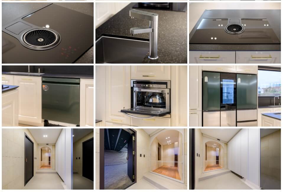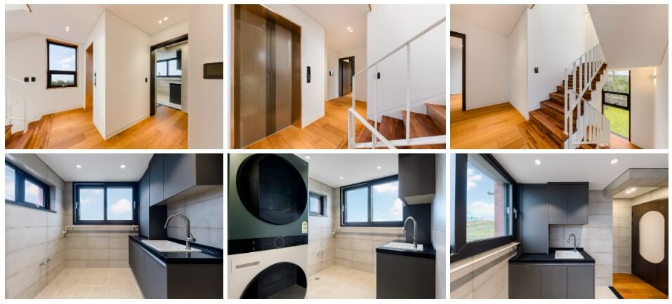 지하 1층에는 벙커주차장과 멀티룸, 지상 층에는 거실과 주방, 그리고 2층에는 마스터룸과 세탁실, 3층에는 추가적인 침실과 욕실이 위치해 있습니다. 거실과 주방은 넓은 공간으로 시공되어 있으며, 주방은 한생치킨바흐 제품으로 시공되었습니다. 마스터룸에는 드레스룸과 전용 욕실이 있으며, 나머지 침실도 시스템장이 설치되어 있습니다.