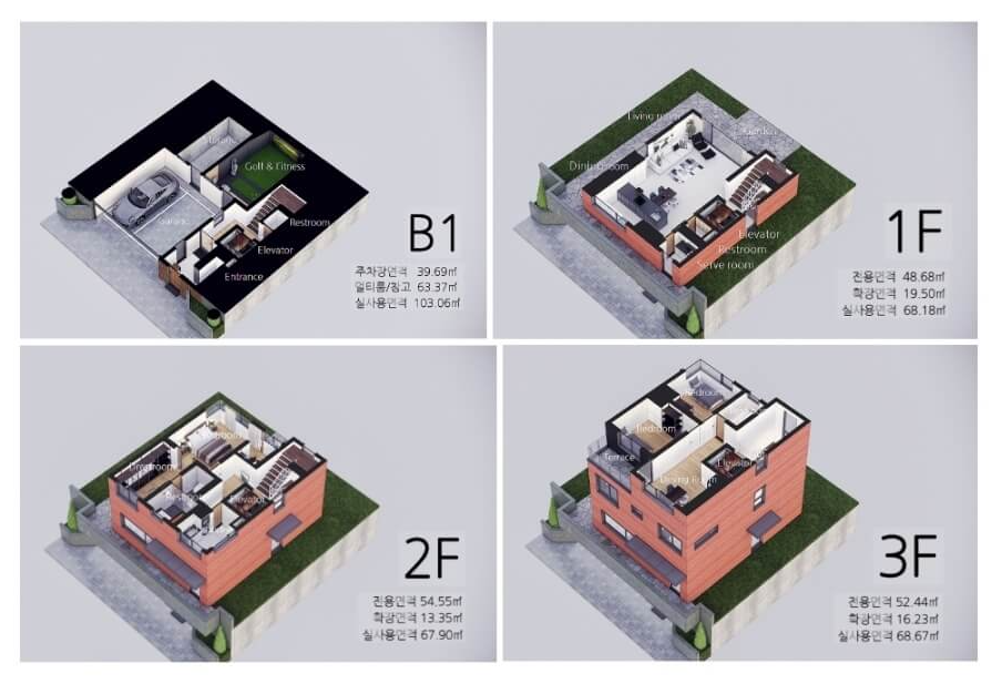 타운하우스는 지하 1층부터 지상 3층까지 구성되어 있지만, 실제로는 1층부터 3층까지의 공간을 활용하여 삶의 불편함을 최소화한 구조입니다.