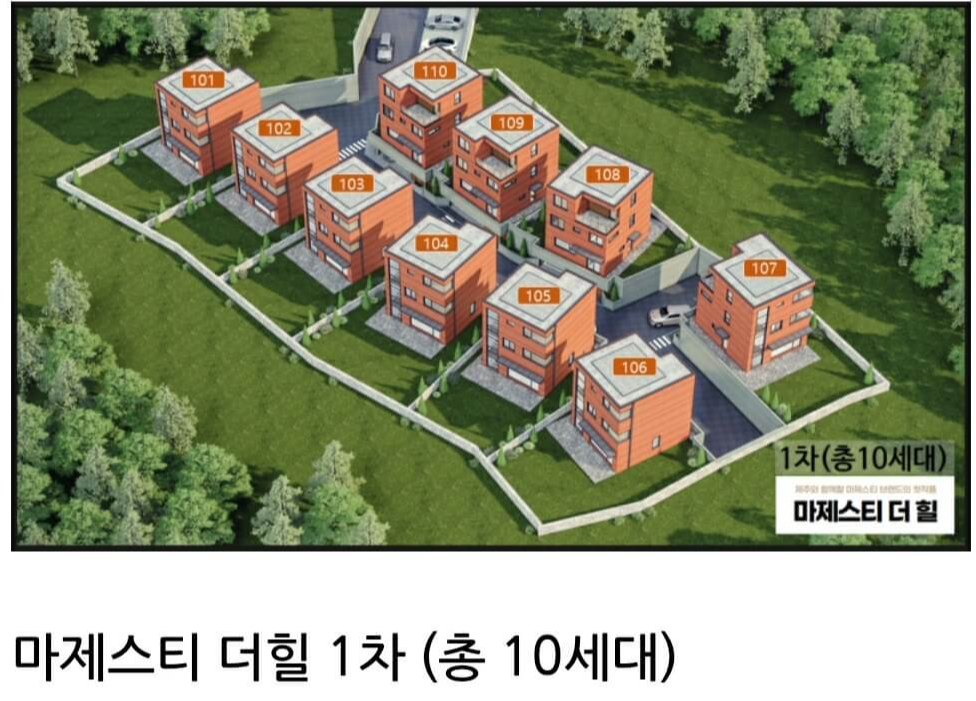 16세대 - 1차 (10세대),2차(6세대) 타입: A-type:101~106동/Btype:107동, 109동, 110동/C-type:108동 아라동에 위치한 마제스티더힐은 지하 1층부터 지상 3층까지 총 10세대로 구성되어 있습니다. 대지면적은 92.95평부터 121.65평까지 다양하며, 전용면적은 78.29평입니다. 각 층별로 구성은 지하 1층에는 주차장과 멀티룸, 지상 층에는 거실, 주방, 화장실 등이 있습니다. 주차는 세대당 2대가 가능하며, 시스템 에어컨 7대, 냉장고, 냉동고, 김치냉장고, 세탁기, 건조기, 광파오븐 등의 옵션이 포함되어 있습니다.