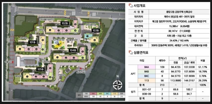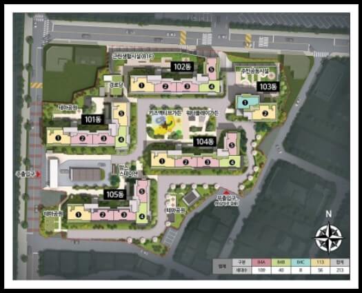 - 84타입, 113 타입 총 213세대/ 지상 10층, 5개 동 규모