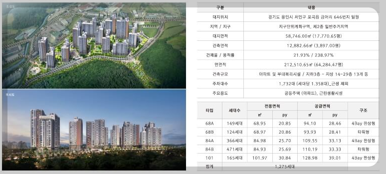 세대수: 68㎡A, 68㎡B, 84㎡A, 84㎡B, 101㎡ 총 1,275세대