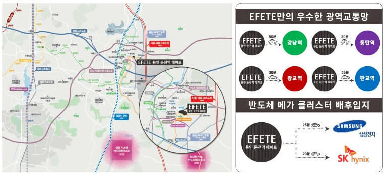 용인 둔전역 에피트가 주목받는 가장 큰 이유는 용인 반도체 클러스터와의 뛰어난 접근성 때문이다. SK하이닉스가 주도하는 용인 반도체 클러스터는 원삼면 일대 약 416만㎡ 규모로 조성되며, 이곳에서 발생하는 주거 수요를 충족할 수 있는 핵심 배후 단지로 자리 잡을 전망이다.