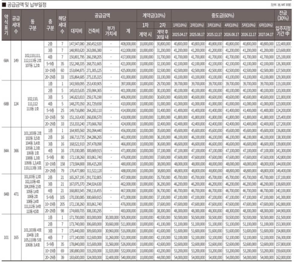세대수: 68㎡A, 68㎡B, 84㎡A, 84㎡B, 101㎡ 총 1,275세대