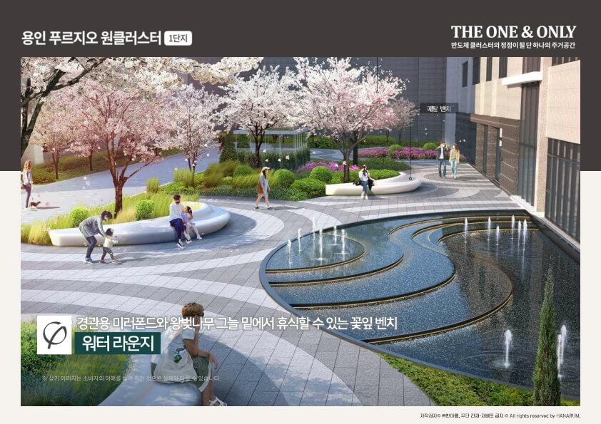 용인 푸르지오 원클러스터 1단지는 사계절 내내 아름다운 자연을 만끽할 수 있는 다양한 조경 공간을 제공합니다. 중앙 광장인 '블루밍 아일랜드'에서는 수경 공간과 꽃을 주제로 한 아름다운 경관을 즐길 수 있으며, '워터 라운지'에서는 미러폰드와 왕벚나무 아래서 휴식을 취할 수 있는 '꽃잎 벤치'가 배치되어 있습니다. 또한, '그라스 가든'은 저토심 구간의 정원을 특화한 공간으로, 다양한 식물들이 어우러져 자연 속에서 산책과 휴식을 즐길 수 있습니다.