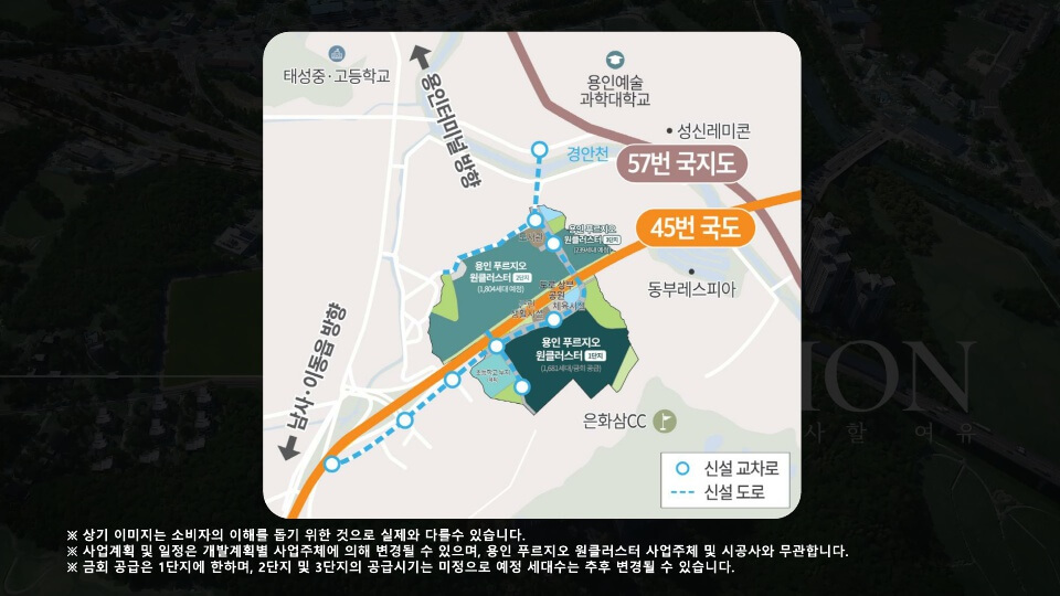 용인 푸르지오 원클러스터 1단지는 경기도 용인시 처인구 남동 은화삼지구에 위치해 있어 뛰어난 교통 접근성을 자랑합니다. 45번 국도를 가로지르는 상부공원화가 예정되어 있어, 입주민들은 더욱 편리하게 주변 지역으로 이동할 수 있으며, 푸르지오 대단지의 특성을 살려 하나의 큰 공간에서 다양한 시설을 자유롭게 이용할 수 있습니다.