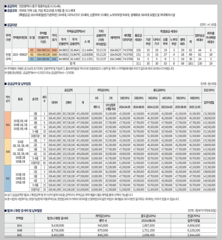 영종하늘도시 A14BL은 인천 중구 운서동에 자리한 첫 대형 아파트입니다. 운서역대라수는 총 311세대로 이루어진 5개 동으로 구성되어 있으며, 지하 1층부터 최고 20층까지 높은 수준의 주거환경과 2026년 8월에 예정되어 있으며, 단지 내 다양한 평형과 타입 84㎡A, B, C으로 구성되어 있습니다.  또한 고급스러운 주거환경을 제공하면서도 시세차익을 기대할 수 있는 최적의 선태지입니다.