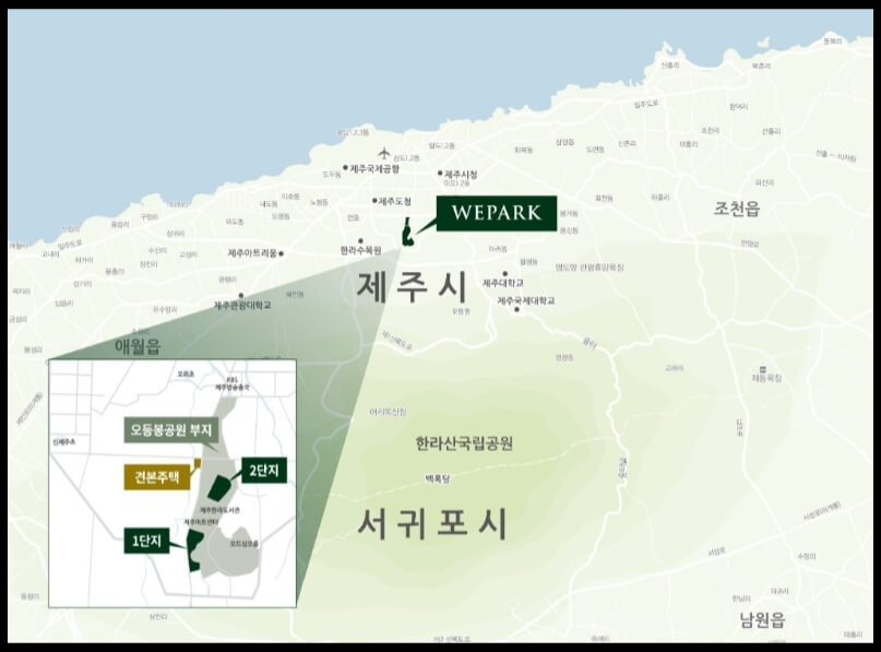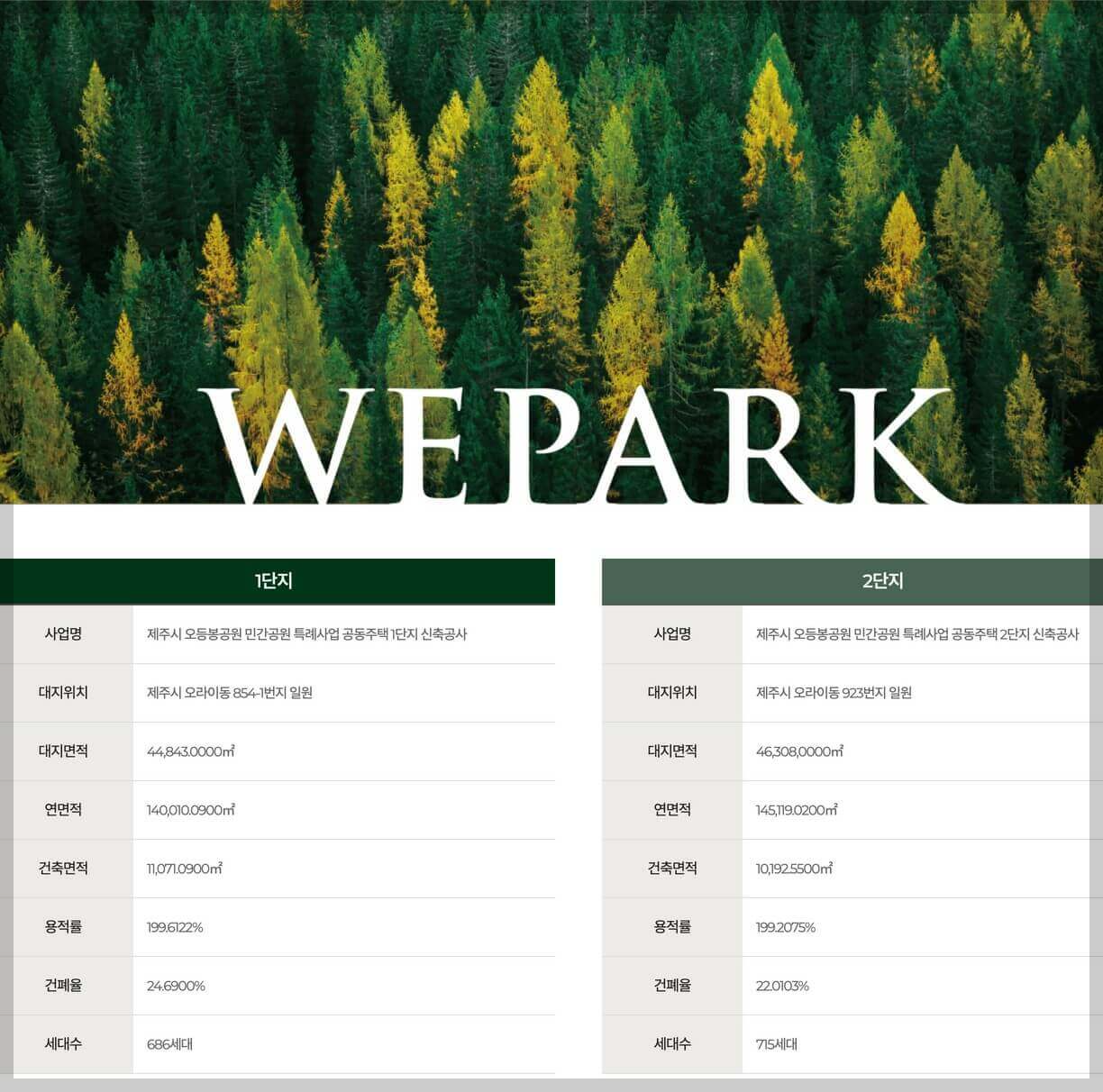 민간공원 특례사업으로 진행되는 이번 아파트 단지는 공원 부지 중 70%는 공원으로 조성되며, 나머지 30%는 아파트 등의 민간 사업으로 활용된다. 이에 '위파크 제주'는 약 76만㎡ 부지에 생태 휴식공간과 공원을 포함한 '공세권' 아파트로, 건강한 여가 생활을 돕는다.