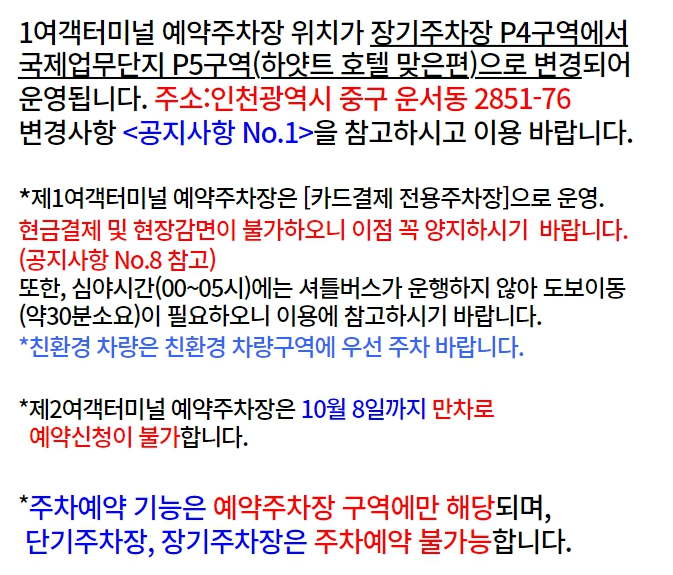 *제1여객터미널 인천 국제공항공사(사옥) 주차장 및 제2여객터미널 제2 합동청사 주차장은 단기주차장 주차요금이 적용됩니다.
