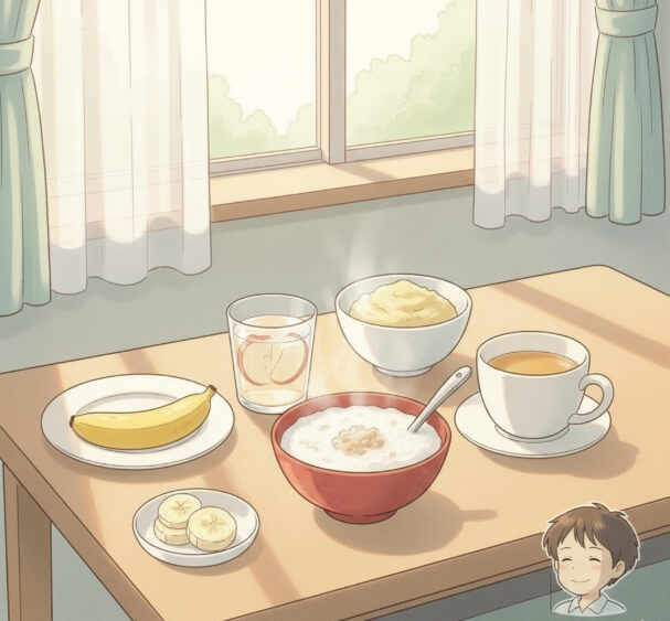 - 2단계 (회복 시작): 바나나, 익힌 사과, 흰쌀죽으로 칼륨, 펙틴을 보충하고 탄수화물을 공급해야 합니다.