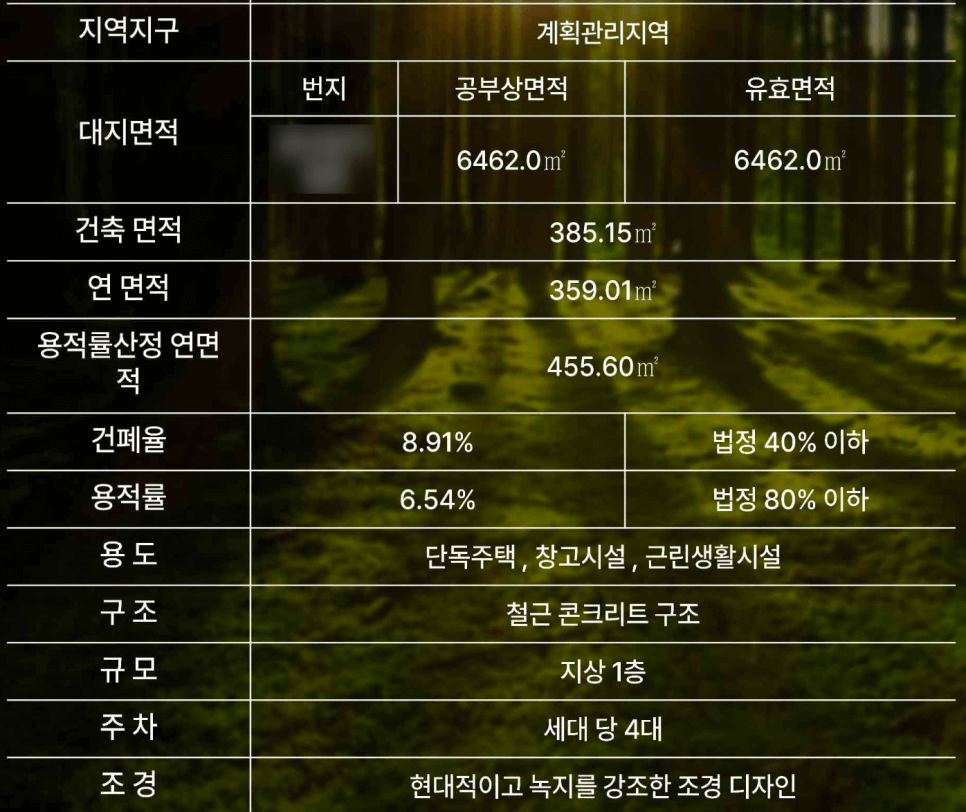 제로 에비뉴는 제주도 서귀포시 대정읍 일원에 위치하며, 계획관리지역 내에 있습니다. 대지면적은 6,462.0㎡이며, 건축면적은 385.15㎡, 연면적은 359.01㎡입니다. 건폐율과 용적률은 각각 법정 기준을 크게 초과하지 않으며, 단독주택과 함께 창고시설과 근린생활시설이 함께 구성되어 있습니다. 철근콘크리트 구조로 설계되었으며, 주차는 세대당 4대가 가능합니다. 조경은 현대적이고 녹지를 강조한 디자인으로 진행되었습니다.