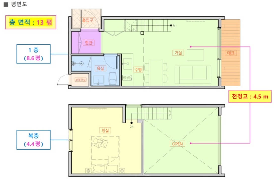 제주 소형 타운하우스는 13평 규모의 복층형 단독주택으로, 실내 공간을 효율적으로 활용할 수 있도록 설계되었습니다.