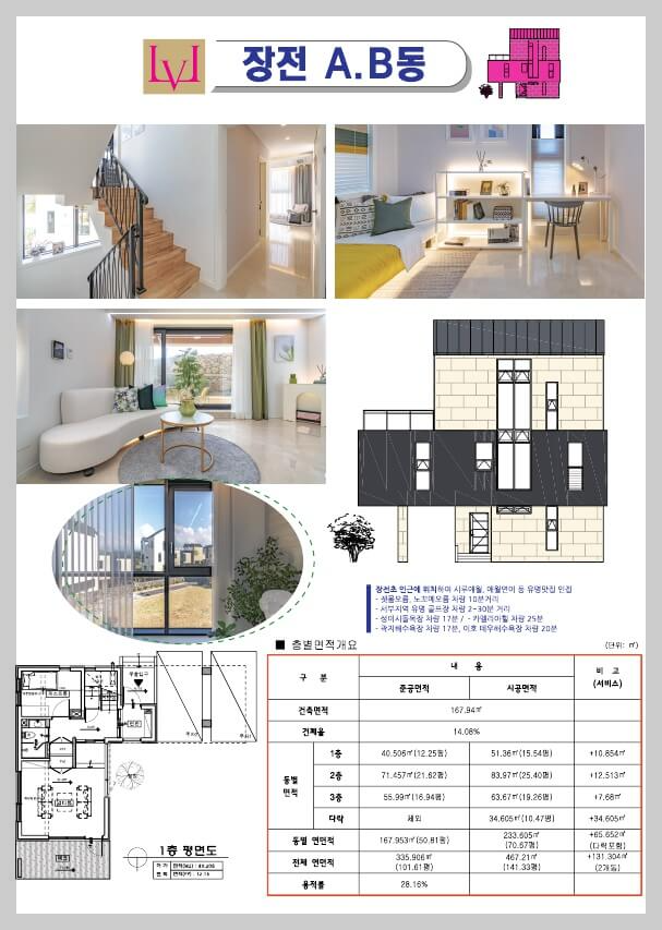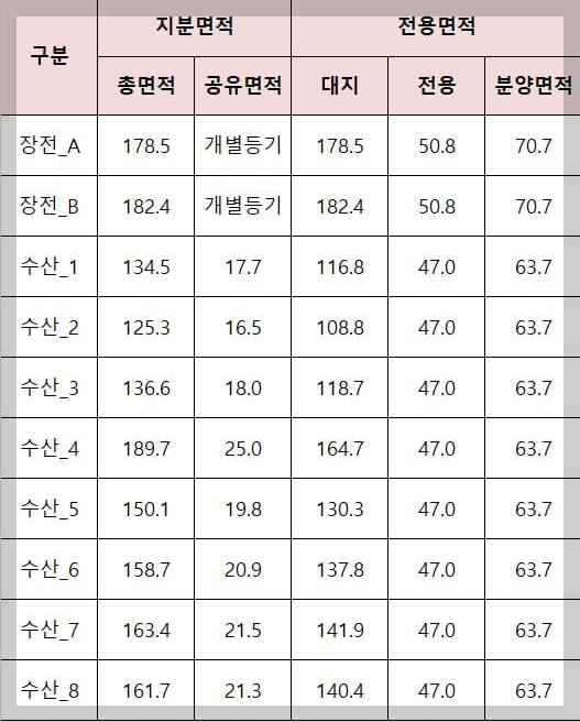면적: 대지면적은 108.8평부터 182.4평, 전용면적은 47평부터 50.8평까지 다양합니다.