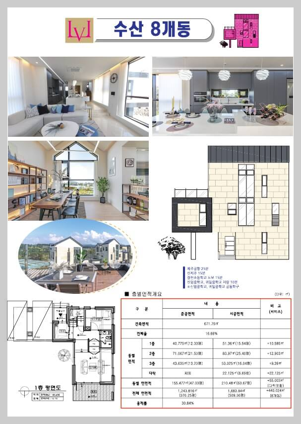 제주 애월 루체비스타는 제주의 아름다운 자연 속에서 편안한 도시 생활을 제공하는 고급 타운하우스입니다. 이곳은 중산간도로 대로변 언덕 위에 위치하여, 애월바다와 한라산의 아름다운 풍경을 감상할 수 있는 최적의 장소입니다. 루체비스타 타운하우스는 3층 구조의 단독주택으로, 개별등기 2세대와 지분등기 8세대로 총 10세대로 구성되어 있습니다. 각 세대는 풀옵션으로 제공되며, 고급스러운 인테리어와 시설이 완벽하게 갖춰져 있습니다. 또한, 제주공항이나 신제주 등으로의 이동이 용이하고 조용한 전원생활을 즐길 수 있는 위치에 있습니다.