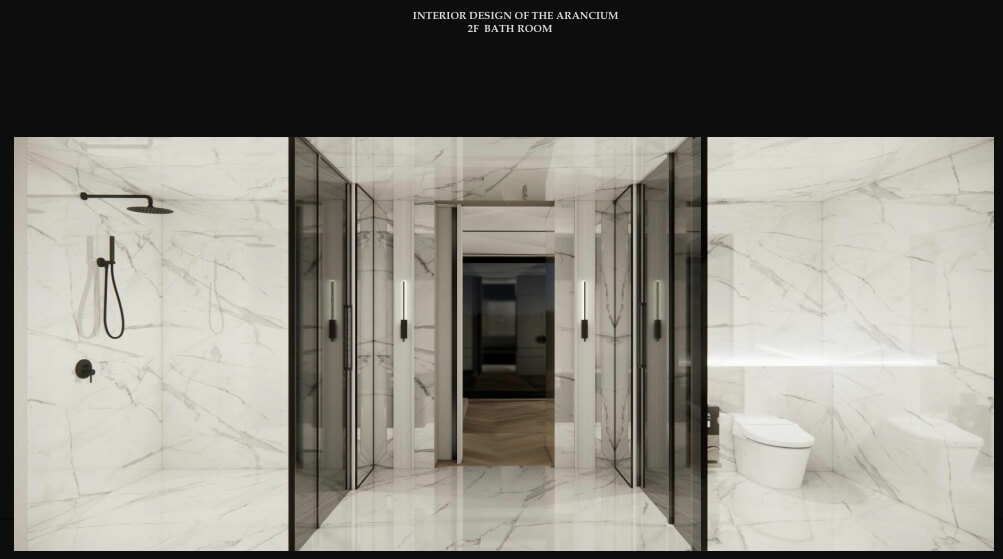 명품 욕실과 최고급 마감재로 완성된 하이엔드 주거 공간 더 아란치움의 욕실은 프리미엄 욕실 브랜드인 AXENT와 TOTO 제품을 사용하여 모던하면서도 클래식한 명품 욕실을 완성했습니다. 또한, 내부는 루이스 폴센(Louis Poulsen) 조명 기구로 세련된 분위기를 더했으며, 슈코(Schuco) 창호 시스템을 통해 에너지 절감과 단열성을 극대화했습니다.