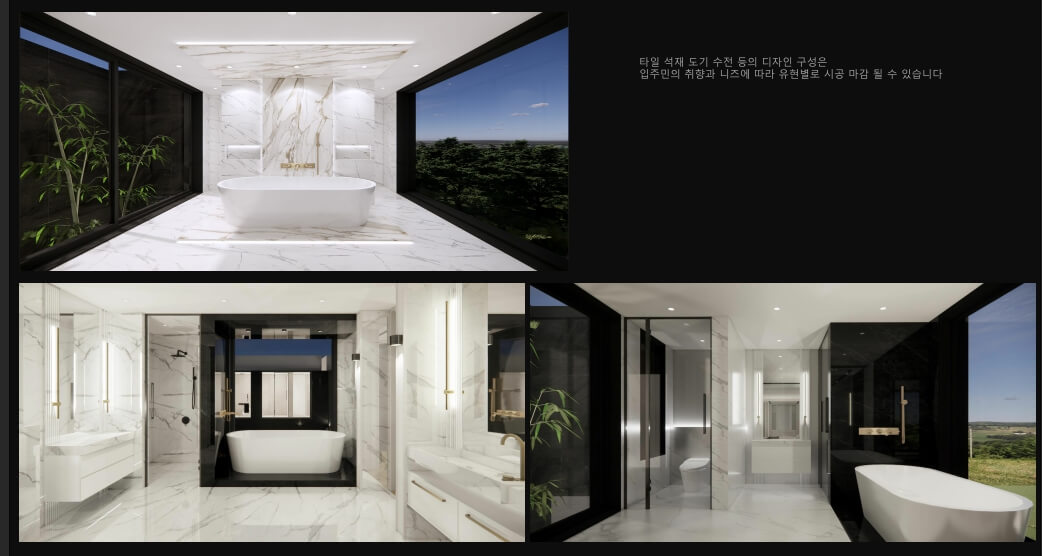 주거 공간의 마감재는 이탈리아 명품 브랜드인 ARIOSTEA의 석재 타일로 구성되어 있으며, 세월이 지나도 그 가치를 잃지 않는 고품질의 자재만을 고집했습니다.