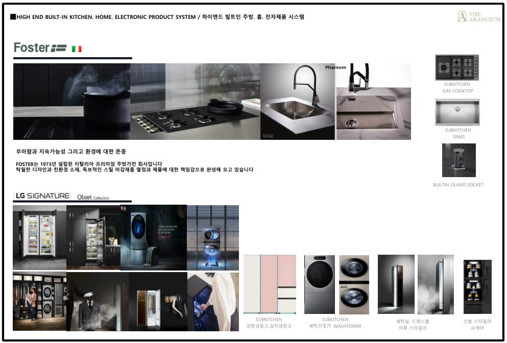 더 아란치움의 내부는 단순한 주거 공간을 넘어 하나의 예술 작품처럼 설계되었습니다. 특히 하이엔드 빌트인 주방 가구 시스템은 세계적인 주방 브랜드인 DADA와 에르네스토메다(Ernestomeda)를 사용하여 간결하고 모던한 디자인을 구현했습니다.