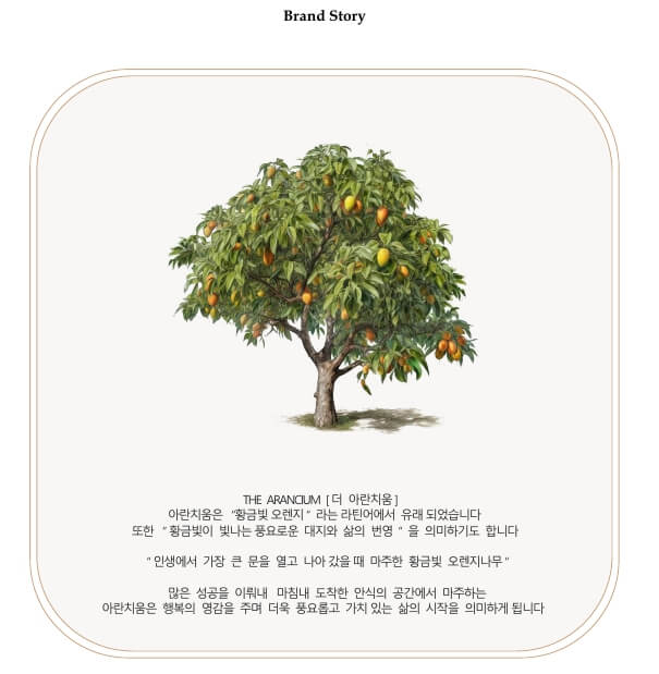 인생의 여정 끝에서 마주한 오렌지 나무 - 더 아란치움에서의 새로운 시작 인생에서 가장 중요한 문을 열고 나아갔을 때 마주한 오렌지 나무는 인생의 성공을 상징합니다. 그 오렌지 나무는 마치 안식과 새로운 영감을 주며, 행복한 삶의 가치를 의미합니다. 이제 우리는 도시의 분주함을 벗어나, 편안하고 고급스러운 주거 환경을 찾고 있습니다. 이러한 갈망을 완벽히 충족시키는 것이 바로 더 아란치움입니다.