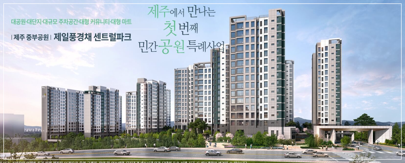 제일건설이 제주시 건입동에 위치한 최신아파트 단지 민간공원 특례사업으로 분양가 33㎡ 당 평균 2425만 원으로 작년 제주 민간 아파트 평균 분양가(2574만 원) 보다 낮은 편에 속하는 '제주 중부공원 제일풍경채 센트럴파크'를 소개하고 있습니다. 아파트 단지는 중부공원에 위치하며, 숲 속에 자리하고 있는 '숲세권 아파트'로서 전망 좋은 아파트로 높은 관심이 기대됩니다.