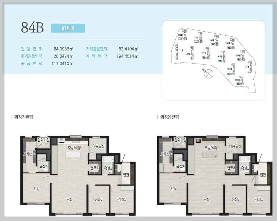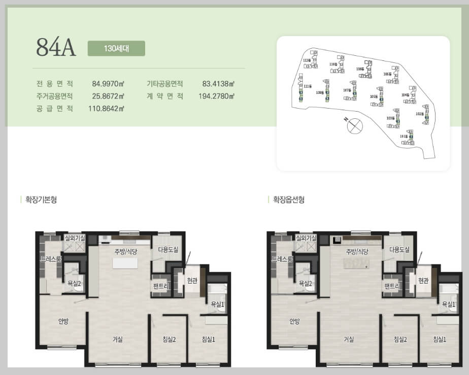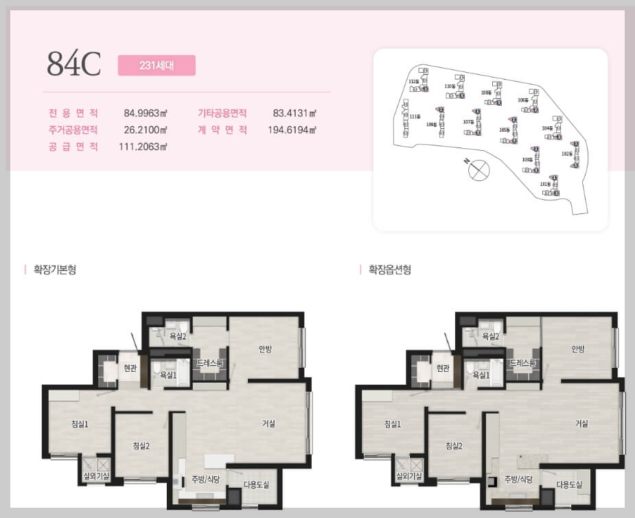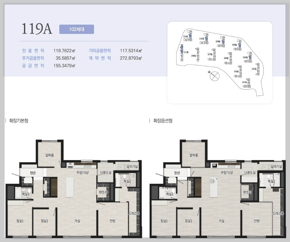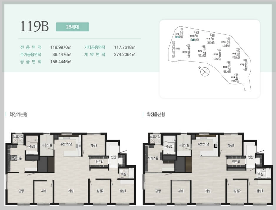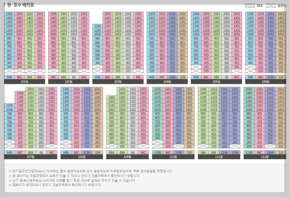 이 단지는 지하 4층부터 지상 15층까지, 총 12개 동으로 구성되며 728가구가 분양될 것입니다. 주거 공간은 전용면적 66~124㎡로 다양한 구성을 갖추고 있으며, 이 중 653 가구(전용 84~124㎡)가 일반에 분양되며, 전용면적별 가구 수는 84㎡ 448세대, 119㎡ 130세대, 124㎡ 75세대입니다. 대부분의 가구가 4 베이(방 3칸과 거실 전면 향 배치) 판상(-자) 형에 남향으로 배치됩니다. 또한, 드레스룸, 팬트리 등의 수납공간이 각 타입별로 제공될 예정입니다. 특히, 전용 119㎡A·B, 124㎡ 타입에는 알파룸이 추가 설계되며, 124㎡ 타입 중 일부는 서재가 추가됩니다.