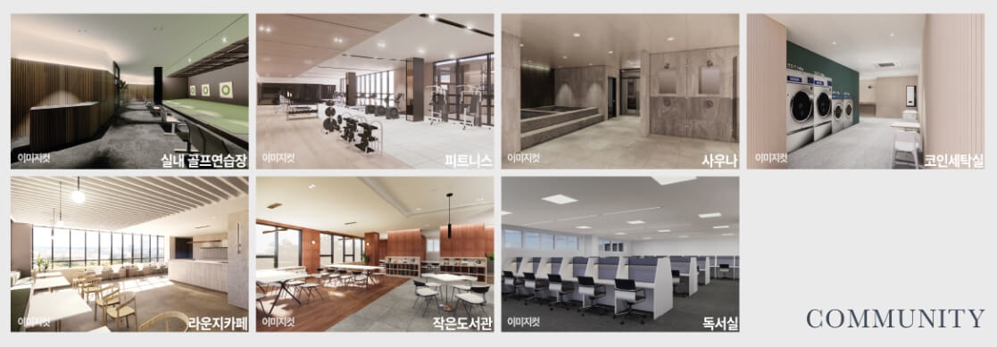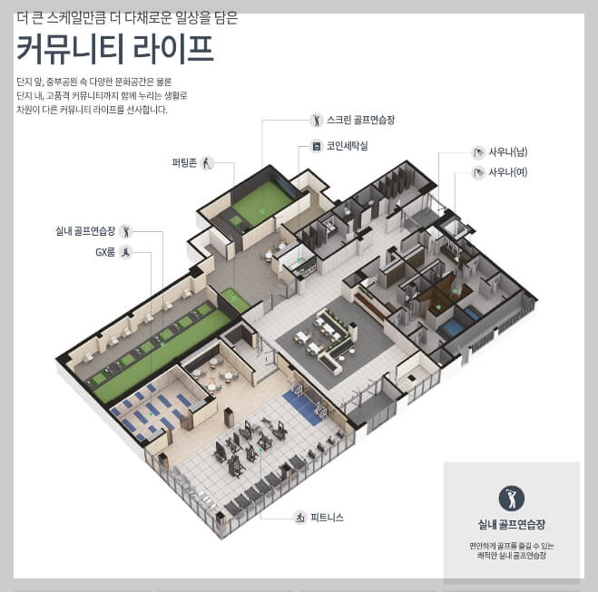 이 외에도 단지 내에는 자연테마정원과 커뮤니티 시설로 피트니스, GX룸, 사우나, 실내 골프연습장, 라운지카페, 코인세탁실 등이 마련되어 있습니다. 또한, 발코니 확장 서비스와 주요 시설에 대한 신경 쓰임이 강조되고 있습니다.