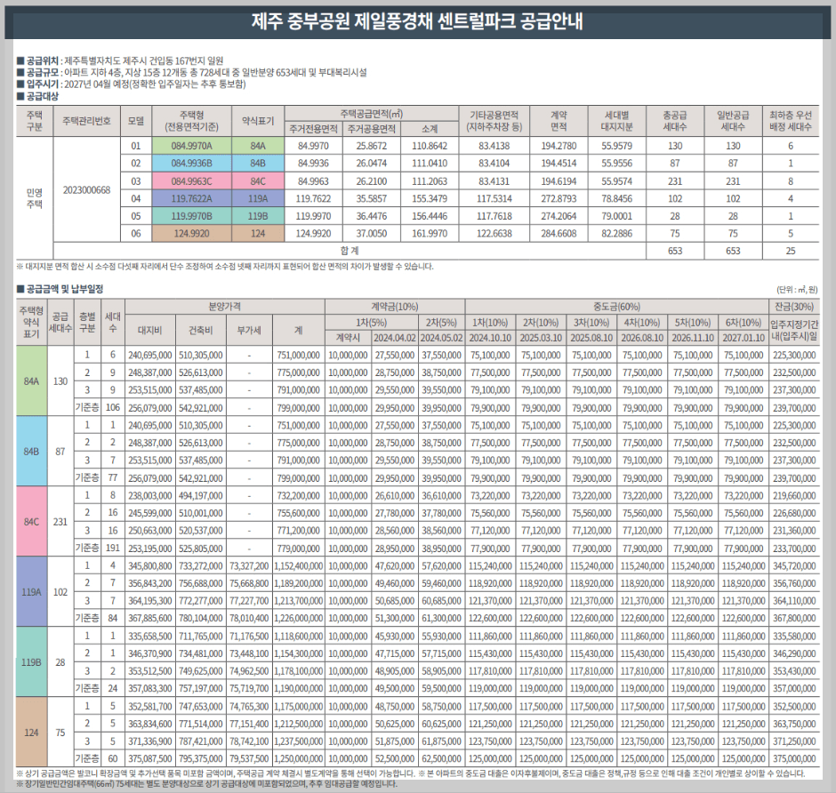 이 단지는 공원 특례사업으로 제주에 처음 공급되는 분양 단지로서, 중부공원은 약 17만㎡로서 축구장 3 배에 달하는 규모로 조성될 예정입니다. 이 공원은 숲과 화원, 하늘숲길, 야외 공연장, 체육시설 등 다양한 시설을 포함하고 있으며, 산책길과 친환경 놀이시설도 함께 조성될 예정입니다.