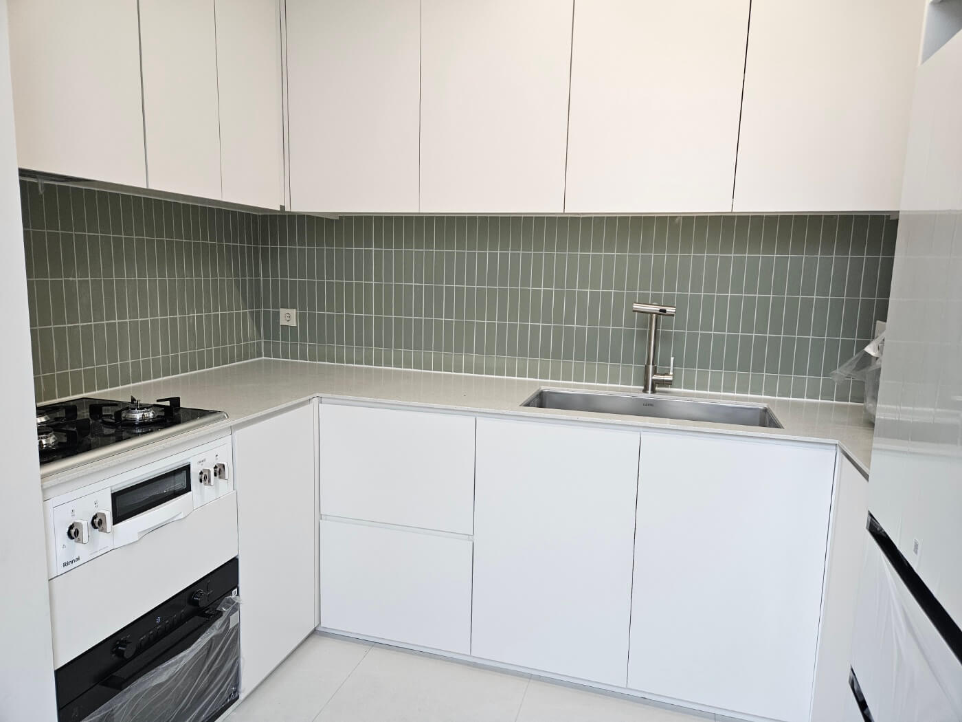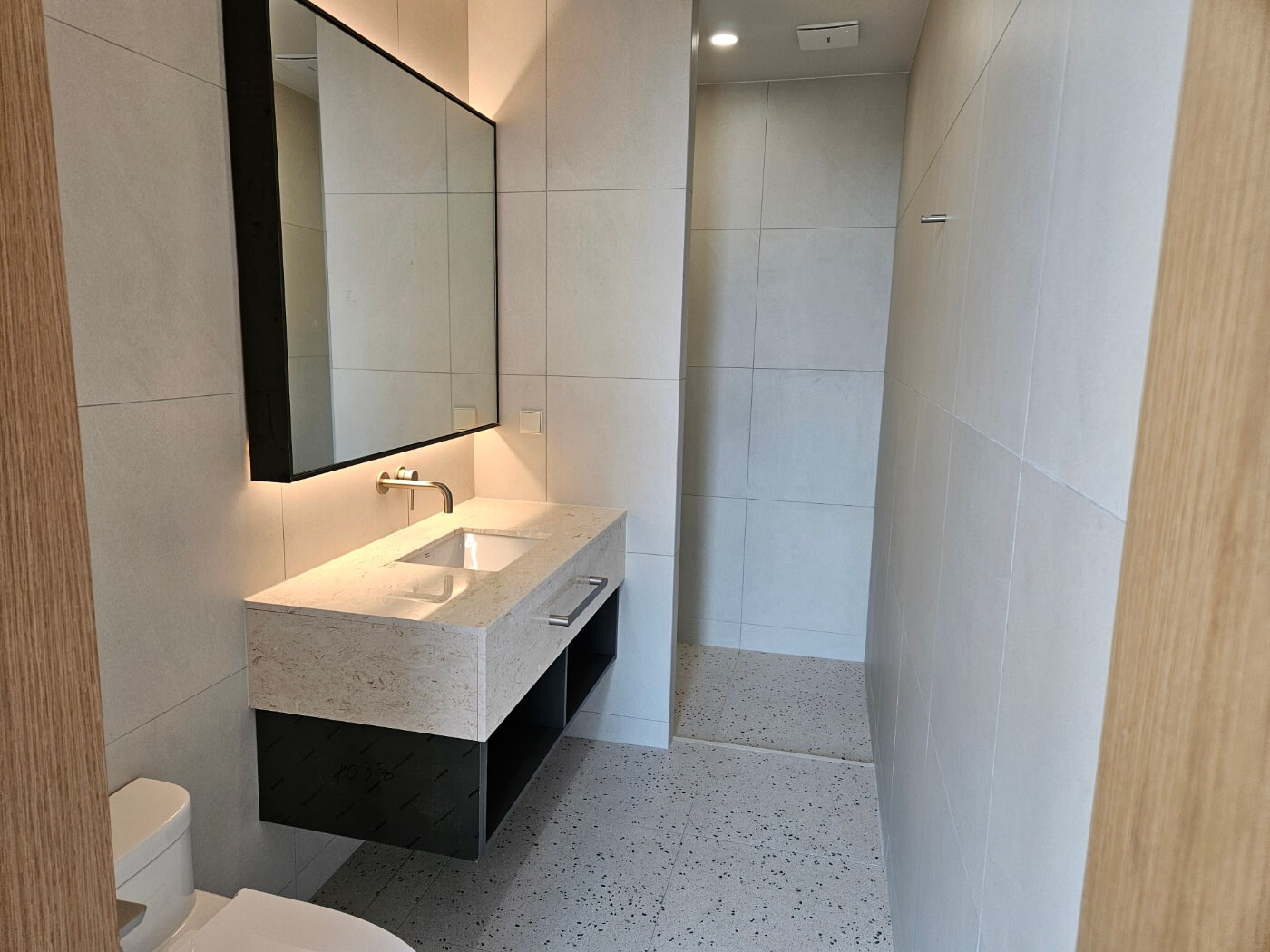 바닥은 대리석으로 마감되었으며, TV 장과 가구는 이탈리아 제품으로 시공되었습니다. 현관 옆 공용 욕실은 이탈리아 타일로 마감되었고, 일체형 비데와 매립식 수전이 설치되어 있어 기능성과 고급스러움을 동시에 만족시킵니다.