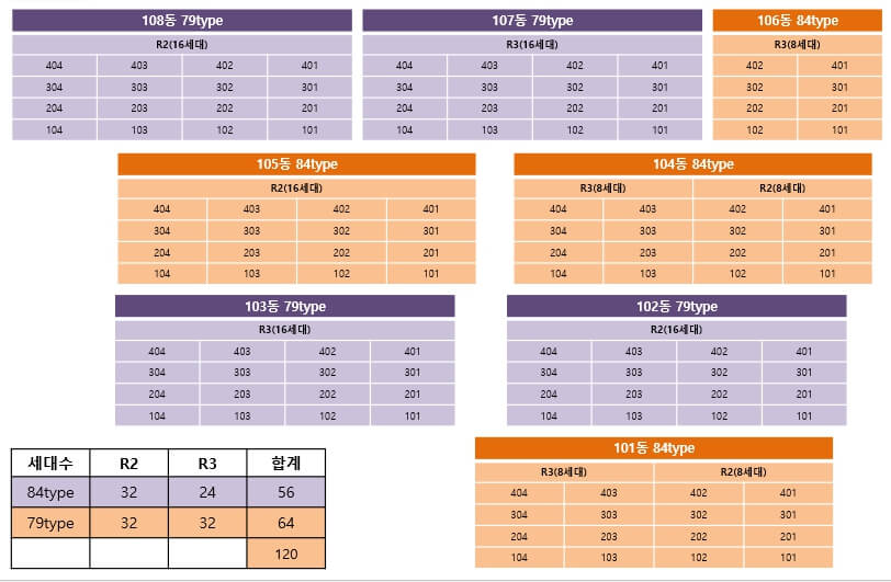 • A 타입: 2룸 + 파우더룸 + 다락 + 테라스 (최상층 한정)